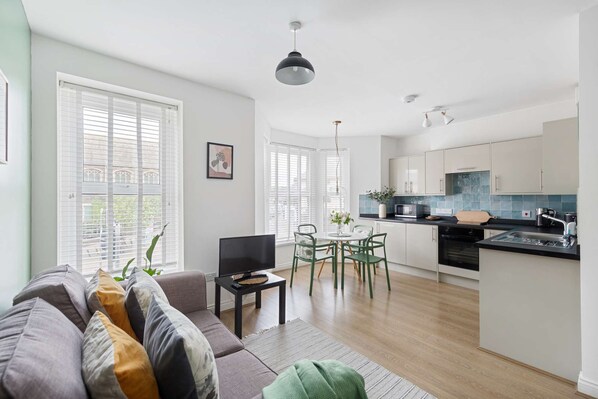 Calming and comfortable would be the words to best describe this apartment! The décor is modern and clean and the space is light and well equipped. The open plan kitchen / living space caters for all needs, with a great area to relax, space to dine (or work if business is your reason for visiting) and the kitchen has all you need for cooking up a feast!