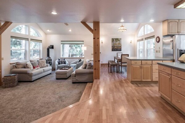 Du kan flykte med dine venner og familie til dette romslige tilfluktsstedet i Lake Lake Tahoe. Dette 3672 kvadratmeter store huset ligger i et skogkledt, privat område, få minutter fra Lake Tahoe strandlinje, og tilbyr en innbydende åpen planløsning, med store vinduer med vakker skogkledd utsikt. Den åpne utformingen knytter det velutstyrte kjøkkenet utstyrt med rustfrie hvitevarer, gasskomfyr, oppvaskmaskin og øy, med den solfylte spiseplass og romslig stue med hvelvede tak. Kos deg med å underholde utenfor sommeren på det store dekket, eller fortsett dagens aktiviteter inne i å spille shuffleboard eller poker i spillrommet. Gjenopplev dagens opplevelser mens du koser deg opp til peisstedet, eller slapp av i den sjarmerende mester-suiten med boblebad, etter en lang dag med en rekke aktiviteter i innsjøen, og oppdag tur- og / eller skiløyper i nærheten. Dette hjemmet har en bonus svigerfamilie, komplett med kjøkkenkrok, stort familierom og soverom for dine gjester som foretrekker litt ekstra privatliv.