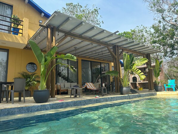 2nd floor: Primary Suite with king size bed, Living Area with Smart TV + Netflix and Prime (you’ll need your personal account), Private Covered Terrace with hammocks for you to relax and a separate balcony with pool views.