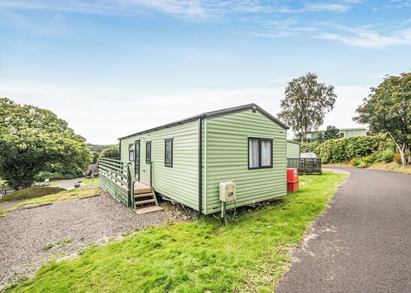 Cosy and relaxed living, this 2 bedroom caravan sleeps 4 people in one double and one twin bedroom. en suite W.C. and wash basin, and family bathroom with W.C., shower and wash basin. Gas central heating throughout the caravan keeps you cosy on those cooler days. The lounge area has an electric fire, TV and the kitchen well equipped with gas cooker and hob, microwave and integrated fridge/freezer. Side door leading onto veranda with outdoor furniture and parking beside accommodation.
