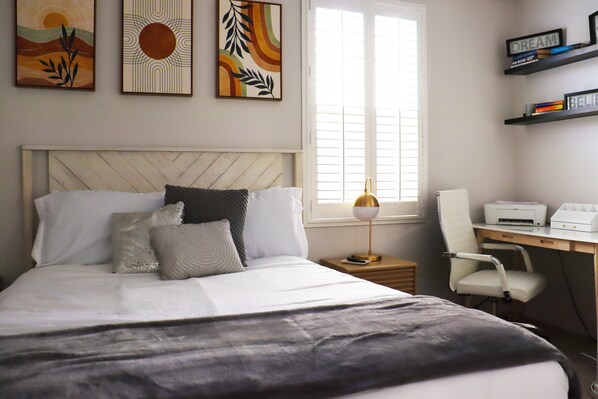 Bedroom 2 located next to the living room, features a queen size bed with a smart TV for your entertainment. A remote work area incase that pops up during your stay, there is also a walk in closet.