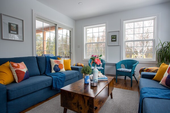This thoughtfully decorated vacation home provides a welcoming atmosphere for guests. Set on a private, treed lot, the cottage features expansive green space, creating an environment where both children and adults can enjoy outdoor play and relaxation.