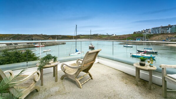 You'll find all you need in the pristine kitchen to whip up lunches and suppers and then opt to stay put at the oak dining table or head outside. The balcony is great to sit outdoors all day in good weather, sunbathing or watching the mesmerising bob of coloured boats in the sparkling sea - binoculars await for bird spotting or sunsets. Three bedrooms are peaceful and pretty- one twin on the ground floor with ensuite.Two bedrooms with Juliette balconies for blissful views upstairs - one twin and one king - both with ensuite bathrooms. You'll nod off listening to gulls and waves.