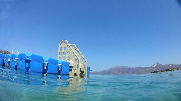 The private beach, pontoon-pier and sun loungers around the pool are free to use.