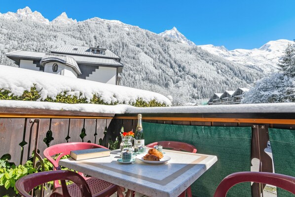 Nyt den fengslende utsikten fra dette 1-roms balkong-tilfluktsstedet i Chamonix Sud!