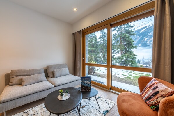The apartment, which sleeps 5 people, is in a modern residence, on a quiet street, just a few minutes walk from the centre of Chamonix. The living area is full of light, thanks to glass sliding doors which lead out to the garden and uninterrupted views of the mountains beyond. The spacious room is furnished with a sofa, armchair, a flat-screen TV and a dining table for five. Next to this is the kitchen which has been beautifully fitted out and is equipped with a combined cooker/induction hob, oven, microwave, fridge/freezer, dishwasher and drip coffee machine.