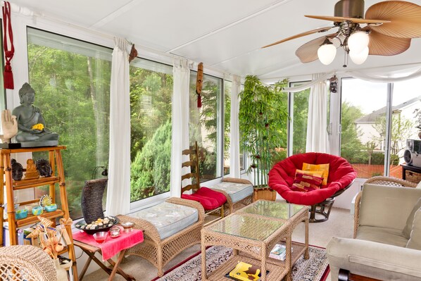 Hjemmet vårt ligger i Chapel Hill, noen mil fra Durham, og bare en kilometer fra jeg 40. Rask 18 kilometer, 20 minutters kjøretur på I 40 W fra RDU flyplass. I nærheten av UNC, Duke, offentlig park, innendørs svømmebasseng, Franklin St. sentrum, jogge- og turstier, tennisbaner etc. Ideell for par, forretningsreisende, familier (med barn) og store grupper. Vakkert anlagt hage, stor inngjerdet hage med trær og gassgrill. Flott utsikt fra glasssalen. Fredelig Buddha-hage rundt koi fiskedam.