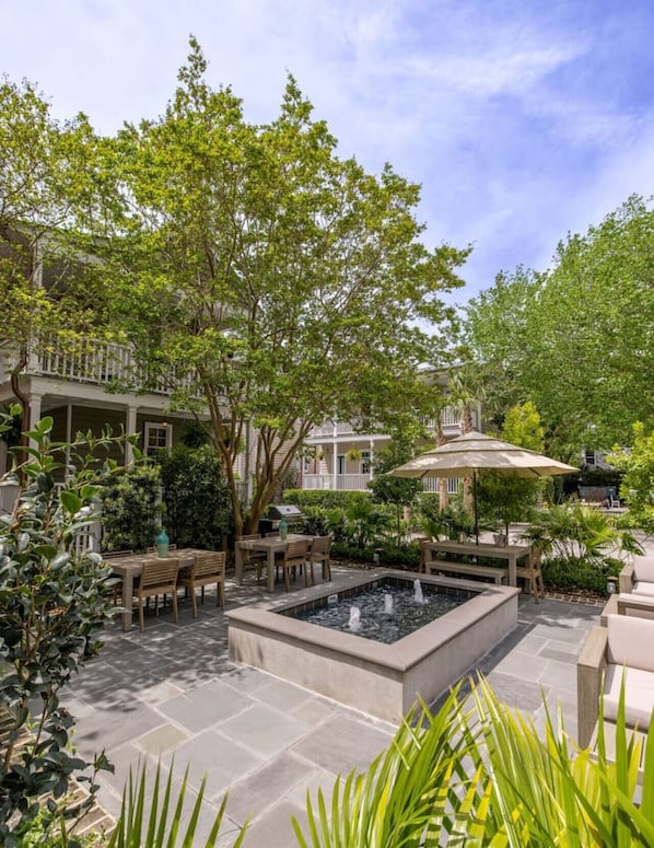 Saint Philip Square is an award-winning collection of 6 historic buildings meticulously curated to enhance your stay in Charleston. “M3” is one of seventeen unique rentals. The grounds feature outdoor garden areas with fountains, dining areas, fire tables and barbecues. In the evenings, this oasis sparkles with outdoor lighting, making it the perfect place for nightcaps after a day of exploring.
