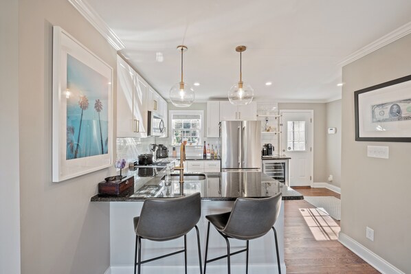 The chef’s kitchen is fully equipped and ready for your stay — featuring stainless appliances, a gas range, granite counters, and a breakfast bar for morning coffee or evening wine from the wine fridge.