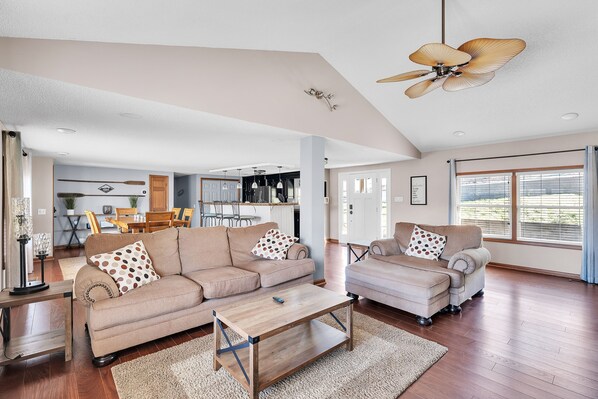 Inside, the fully equipped kitchen makes meal prep a breeze, while the