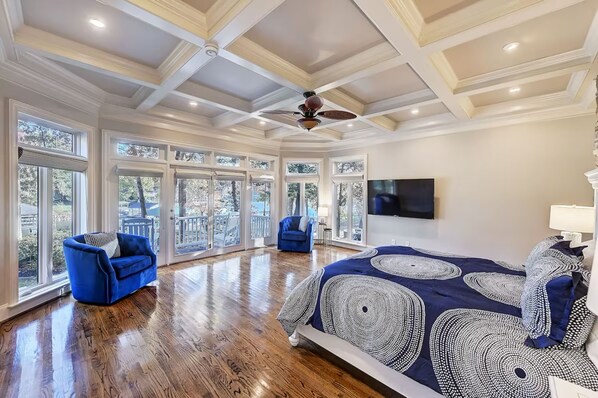 Off the kitchen, you’ll find the newly renovated main-level primary bedroom. Featuring a king bed, TV, and a spacious en-suite bathroom with a walk-in closet, this bedroom provides a relaxing escape. Plus, guests staying in this room will enjoy private access to the wrap-around deck, making it the perfect spot to wake up to the peaceful sounds of the lake while enjoying a morning coffee in the fresh air.