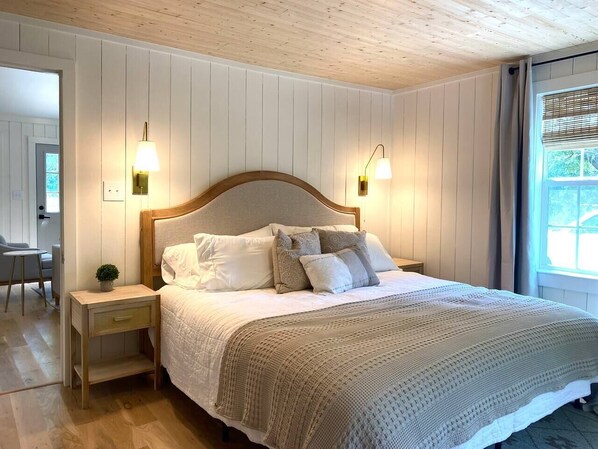 Beautiful natural light, vaulted ceilings, gorgeous chandelier, vertical shiplap, gold hardware and neutral, soothing decor. Let your eyes rest in this soothing abode. Relax in the open space making it easy to chat on the sofa while some cooks in the kitchen. Our smart ROKU tv allows you stream your own streaming accounts. Head to the master bedroom where a new king mattress awaits with its own ensuite bathroom and rainfall shower head. We have a cozy (ie small) second bedroom that has a full bed with a lofted twin mattress over the full bunk for a whimsical room that allows additional sleeping options. To sleep 3 in this room, I recommend kids or 2 adults understanding that one will have to climb to the lofted twin bed.