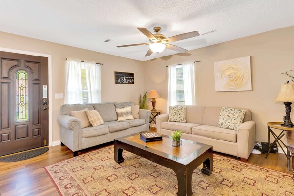Relax on the private back porch with a country serenity feel with large oak trees. Enjoy a restful evening in the brand-new private hot tub just off the patio with a fire pit. Roast marshmallows or just enjoy conversation with your entire party while lounging on the new Adirondack chairs. Patio furniture and charcoal grill are also available to spice up mealtime! Enjoy access to a fully equipped kitchen with a stove, oven, microwave, refrigerator, dishwasher, and coffee maker as well as dishes and utensils to make cooking meals a breeze! Attached to the kitchen is a closet with a washer/dryer for you to use throughout your stay. Sleeps 10 comfortably. Enjoy a restful night’s sleep in a super comfortable queen-sized bed in the master bedroom with an attached bathroom for extra privacy. The master bedroom has an additional door that leads to the backyard of the house (the only way to access the backyard from within the home). The three other bedrooms (queen, queen, and 2 twins) are off the hallway and share a bathroom. The living room features an open concept with a large sectional reclining sofa with plenty of room for your group. In addition, is a sleeper sofa. In the living room is also a large flat-screen TV and Chattanooga’s award-winning high-speed internet. Work in comfort with the fastest fiber-optic internet service. There is no additional charge for this service. This 4 bedroom / 2 bath home is advantageous for a variety of travelers including families with children who desire the perfect place to relax in the heart of Chattanooga.