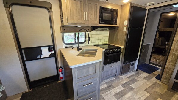 Located just minutes from Cheboygan, this camper is ideal if you just need a place to sleep while up north visiting family or friends. With 2 cozy bedrooms - one up front with a queen bed and the other in the back with a top queen bunk bed when pulled down, and when pushed up it allows access to the dining table, The bathroom features a shower, sink and toilet, and with heating and AC ensure an enjoyable stay no matter the season. Located just 0.2 miles from state land public trail access, also 7 minutes from Cheboygan in one direction and 34 minutes to Rogers City in the other direction. If Mackinaw City is what you're after, we are only 25 minutes from the bridge. We'll be available to answer any questions while you stay at our place. This property is located in the front yard of the owners home but with the positioning of the camper you'll have plenty of your own privacy. Electric and water are hooked up, but no sewer hook up. The black and grey tanks will be emptied every couple days or more if needed. This is not a campsite or campground, this would be most fitting if you are coming to the area for something else and just need somewhere to sleep or get away from the family you are here to visit! It is located on us hwy 23, which is a pretty busy and fast road so keep that in mind if you bring kids. There is a fire ring for those night time campfires.