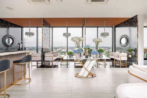 For those seeking an active lifestyle, our state-of-the-art fitness center offers a well-equipped space for both intense workouts and mindful stretches, all with panoramic city views to keep you inspired.