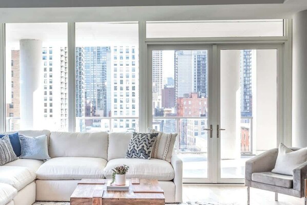 Our unique one of a kind lofts are located in Chicago's newest luxury building with views overlooking the city and are the most high-end rental offering in the city. The unit comprised of 2 side-by-side luxury units, sleeping 28+ people comfortably and is perfectly situated for large groups, families, events, and curated dinners. In each unit, everything flows around the spacious and open living rooms and chef's kitchens, add the floor to ceiling windows with connecting outdoor patio and the space becomes a unique environment for entertaining and gathering with your group.