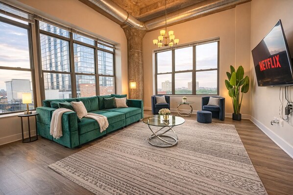 Perfectly located just steps from McCormick Place, Soldier Field, and the heart of the South Loop. This bright and modern 3-bedroom, 2-bathroom corner suite offers comfort, space, and unbeatable city access. Whether you're here for a convention, vacation, or remote work, our suite is tailored to fit groups of up to 10 guests comfortably.