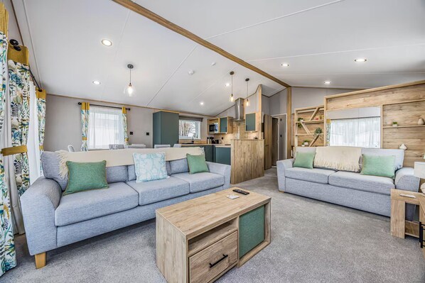 RELAXING & EATING After a day of exploring, enter in the large welcoming entrance area with handing space and cupboards. Unwind in the bright and welcoming sitting room, complete with comfortable sofas, and a 55" Smart TV (please use your own logins for streaming). Enjoy a homemade meal or takeaway with family or friends around the dining table with seating for six.