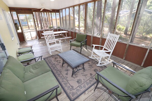 Located in lovely Piney Island within a short bike ride to the beach. This single story 2 bedroom, 1.5 bathroom house offers a large screened porch, fully equipped kitchen and spacious living room. Tall Pines has two bedrooms, one with a queen, and other featuring two twins. There is also an air mattress for guest use. Piney Island offers community water access great for launching kayaks/canoes. To top it all off, Tall Pines is pet friendly with and outdoor dog run in the yard. You won't be disappointed! | | Note: Water access is a shared with the community just a short distance from the rental home.
