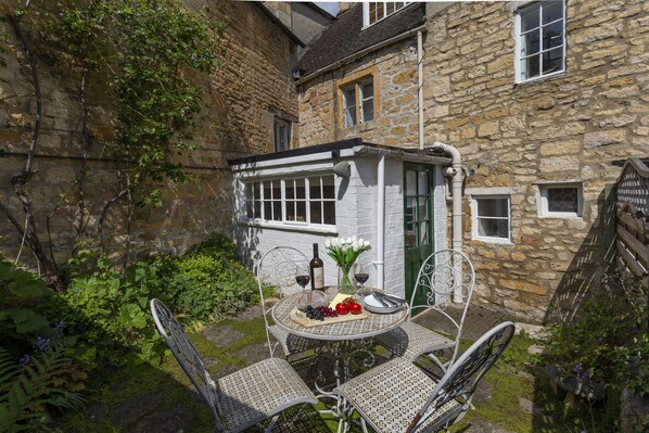 A back door leads out from the kitchen to a lovely courtyard garden, which contains a table and four chairs, as well as a charcoal barbecue. There is a shed in the garden, which contains a washing machine and tumble dryer.