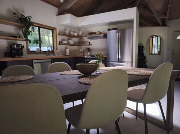 Where you'll be staying: The house features a unique, exposed wood beam, octagonal-shaped, open-concept main living area with lots of windows showcasing the natural surroundings. Neutral tones and natural elements create a calm vibe for your relaxing stay, away from the hustle & bustle. The kitchen comes with a large dining room table and is fully equipped with everything you need for your stay. The master bedroom has a king-sized bed with a wood stove and shares an open-concept ceiling with the loft bedroom. The cozy loft bedroom has a double-wide bed. On the other side of the house, you will find another bedroom with a queen size bed & Tv.