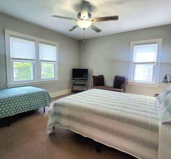 1 Queen Bed, 1 Twin Bed, Roku TV, Vanity With Mirror, Ceiling Fan, Large Walk-In Closet With A Window, Motion Activated Light and Laundry Basket