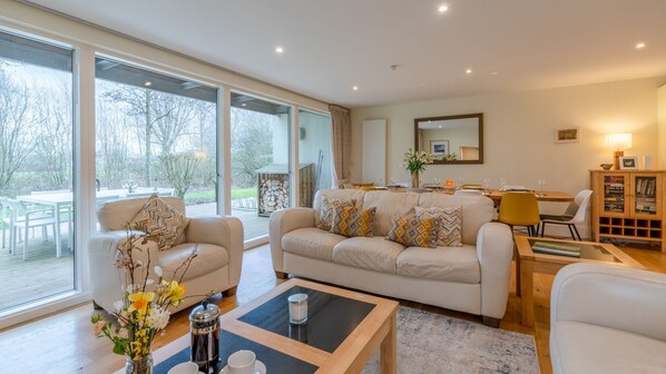 Set over three floors Songthrush is a well-equipped home from home. The ground floor living area opens on to the terrace allowing you to bring the outdoors in and maximise this space. The cosy sitting area nestles around a wood burning stove and the Smart TV and DVD player provide the evening's entertainment. Cherish meals together as you all sit at the dining table for a homecooked dinner made in the spacious kitchen. At the end of the day, Songthrush offers the choice of five bedrooms which suit a number of different group combinations whether you are two families sharing, or a group of friends.