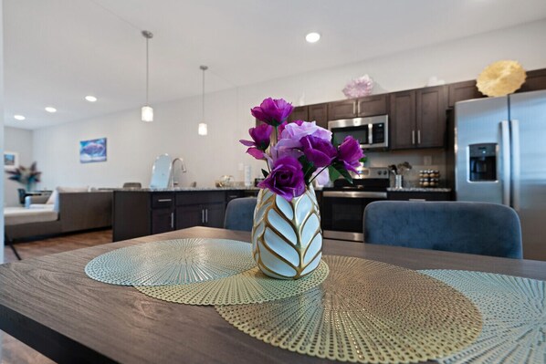 Your contemporary living room where bold turquoise blends with subtle hints of rich purple, vibrant yet harmonious space throughout the house. You’ll love sinking into the spacious couch after a long day of work or exploring the city. Enjoy the stylish decor, refreshing atmosphere, and a fully stocked kitchen, complete with coffee, an air fryer, and plenty of dining space. There’s also a workspace and a smart TV downstairs, ensuring you have everything you need to feel right at home. **Do not lock the bottom lock. **No SMOKING to include hookah, vaping, marijuana, cigarettes, & etc inside unit!! $500FINE. **No PARTIES or large gatherings $500 FINE- You will be asked to leave with NO refund‼️ **No Unauthorized pets $500 FINE** Owner allergic to animals **No unauthorized overnight guest in unit without adding them to reservation. **Please take out all of trash before leaving. **Residential complex with quiet hours 10pm-7am. ** Place dishes in the dishwasher before leaving. **Place towels on master bathroom floor **Bedding can remain on beds **Late check out fees are $50/hr past 11am. We typically have same day check-ins so it is imperative to be checked out by 11am. *Check-in is at 4pm & check out is at 11am.