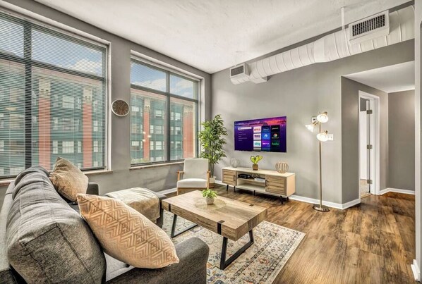 You will immediately be welcomed by the open light-filled space. With the comfy sofa, modern decor, coffee table to set drinks and snacks on, and a smart TV, this living room will be your perfect spot to unwind after a day of exploring all Cleveland has to offer.