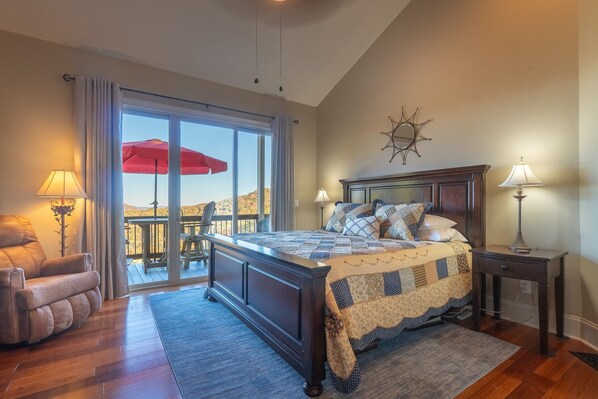 * Upstairs Bedroom 1: King sleigh bed, a private bathroom, and beautiful mountain views.
