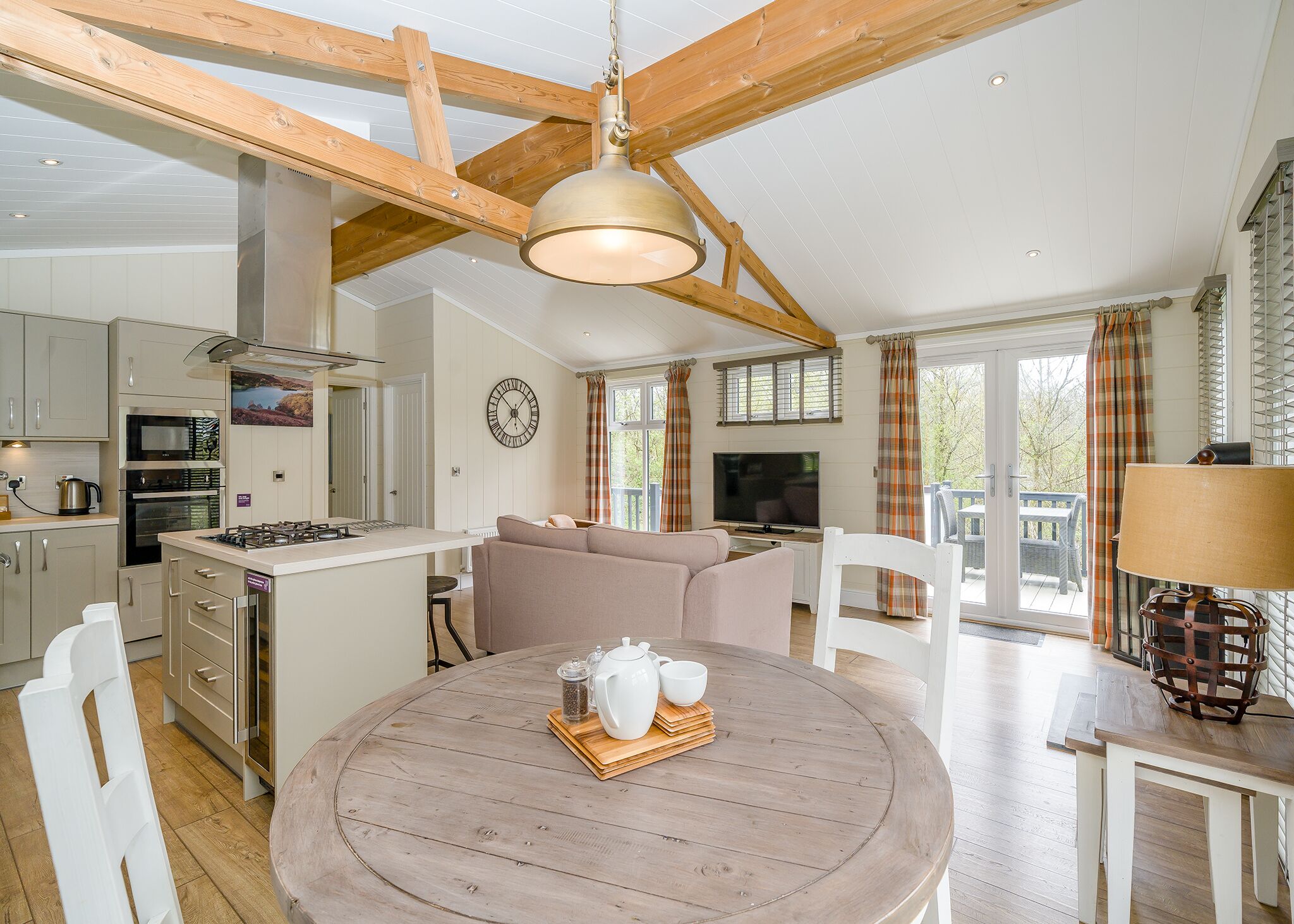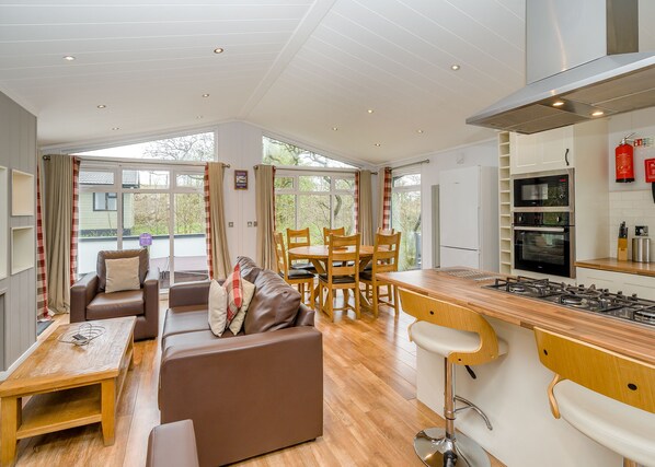 Discover tranquillity amongst the trees in this stylish lodge, perfectly situated for an exceptional family break. Indulge in the luxurious open-plan living space, featuring a large Flatscreen TV, inviting sofas, a modern kitchen with a breakfast bar, and a chic dining area for shared moments. The contemporary double bedroom offers an en suite bathroom with a bath and overhead shower with a rainfall head, while a well-sized and comfortable twin room boasts its own en suite bathroom with a bath and overhead shower. Open the enchanting French doors leading to the decking, an ideal retreat for enjoying the view and unwinding in your private hot tub. For those planning to bring a beloved pet, utilize the pet filter during the booking process to inform the resort in advance. Immerse yourself in nature’s embrace, create cherished memories, and let this stylish lodge be the perfect haven for your family break.. Escape to the breathtaking beauty of the Lake District and experience an unforgettable break at Keswick Reach Lodge Retreat, part of our Evermore Lodge Holidays Collection. Voted the best in Britain, this amazing resort offers a range of luxurious lodges and contemporary holiday homes, ensuring a fantastic stay for everyone.
