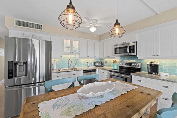 The kitchen is a delightful blend of modern convenience and coastal aesthetics. Coastal bead board shaker cabinets are stocked with pots, pans, plates, utensils, and glassware. The dining area comfortably seats four, and creates a perfect gathering place to sit and reminisce over the days events.
