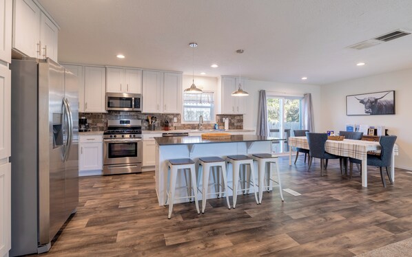 Welcome to The Salsbury Star! This new home, built in 2023, is perfectly located in the heart of historic downtown Cody. From here, you're just a short walk to local restaurants, boutique shops, museums and much more. Whether you're planning a family getaway or a trip with friends, this home offers the ideal blend of modern comfort and Western charm. This home is pet friendly, so bring your four-legged family members! Inside, you'll find four spacious bedrooms that comfortably sleep up to 8 guests. Bedroom 1 features a queen bed, ample closet space and an en suite bathroom with walk in tiled shower. On the other end of the home are bedrooms 2 and 3 with Queen size beds. Bedroom 4 has 2 twin size beds. Bathroom 2 has a combination tub/shower. All of the spacious bedrooms have clothing storage and everything you need for a comfortable night's rest. The bright, fully equipped kitchen makes it easy to prepare meals. Sip your morning coffee at the breakfast bar while planning the days adventures. The dining area features an expandable table with seating for everyone to gather together. After a day of exploring, relax in the cozy living room with comfortable seating and a smart TV for streaming your favorite shows. Step outside to enjoy the private patio with fire pit and bbq grill, perfect for s'mores, dining al fresco, stargazing, or simply unwinding in the fresh Wyoming air. Make quality memories together at The Salsbury Star. *Please note: this property is dog friendly only cats are not permitted. Accommodations: Bedroom 1: Queen bed with en suite bathroom Bathroom 1 (en suite): Tiled walk in shower Bedroom 2: Queen bed Bedroom 3: Queen bed Bedroom 4: Two twin beds Bathroom 2 with tub shower combo Maximum occupancy: 8 guests Monthly Rental Information: For stays longer than 30 days, a completed and signed rental agreement is required prior to occupancy. The agreement must be signed by the primary renter responsible for the reservation. For stays longer than 30 nights, a security deposit may be applied by Cody Lodging Company.