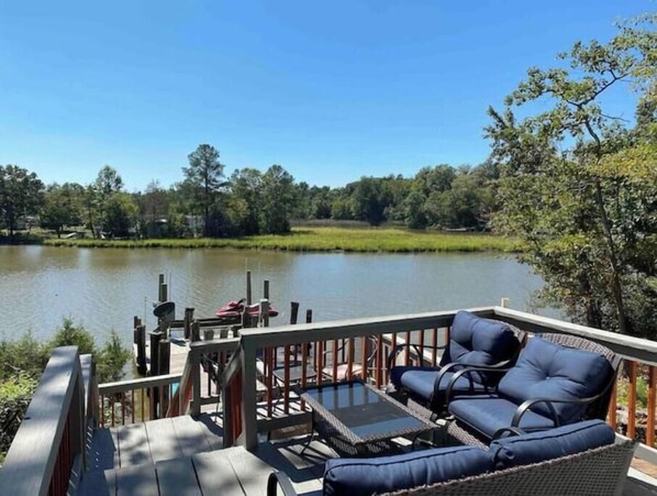 This waterfront home has a private pier. Guests can enjoy the peaceful view of the Creek while having breakfast, or watch wildlife from the overlook deck while sipping your favorite wine.