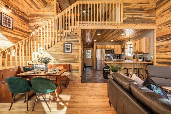 The cabin sits on a large property with seemingly endless activities to keep you entertained. There is a wood firepit and chairs, and there are yard games like frisbee golf, yard dice, and giant jenga. There is a large deck wrapped in string lights with a grill, rustic picnic table for outdoor dining, and a patio furniture set. There is a gorgeous cedar barrel sauna for relaxing.