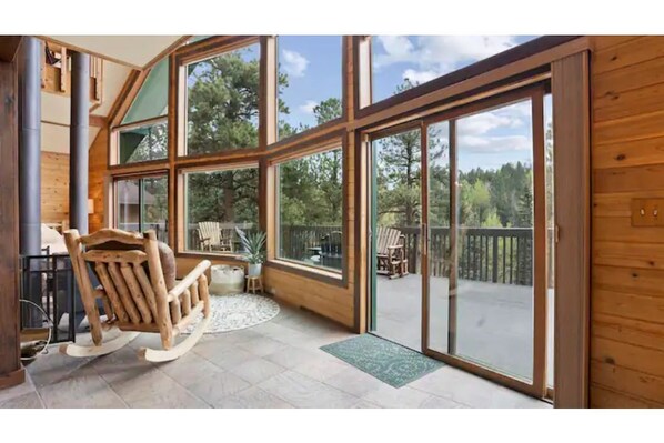 The living area has a smart TV, board games, and blankets as well as a pellet stove for cozy winter nights, and has a walk-out to the hot tub where you can enjoy a soak after a long hike or day of sightseeing.