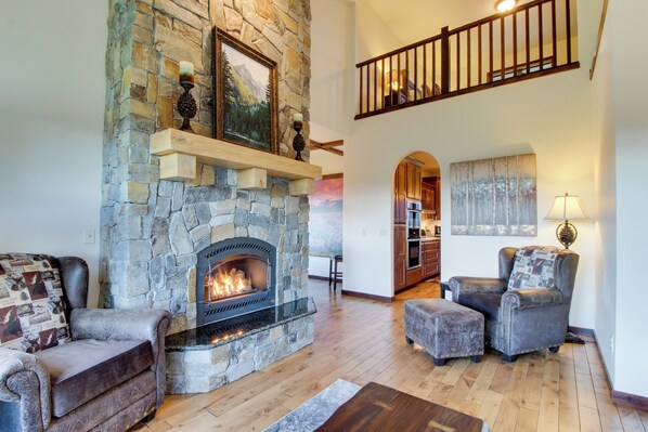 Fjellutsikt er synlig fra mange av vinduene, og tregulv og andre dekorative funksjoner gjør dette hjemmet elegant og innbydende. Det er et oppholdsrom med en steinhage, et familierom med en seksjonssofa og stoler, og et TV-rom, så det er enkelt å dele seg inn i grupper for separate aktiviteter. Med et biljardbord i spillrommet, tre flatskjerm-TVer og WiFi, er det mye å gjøre for moro skyld.