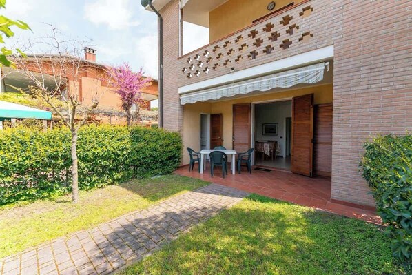 Three-room apartment for rent a few steps from the pedestrian center, entrance with private garden; equipped with a covered patio with outdoor furniture, barbecue and two storage rooms with washing machine; consisting of living room with double sofa bed and TV, kitchenette with fridge and freezer, night hallway, a double bedroom and a room with two single beds from which you can access a back garden, bathroom with shower. equipped with air conditioning and private parking space.