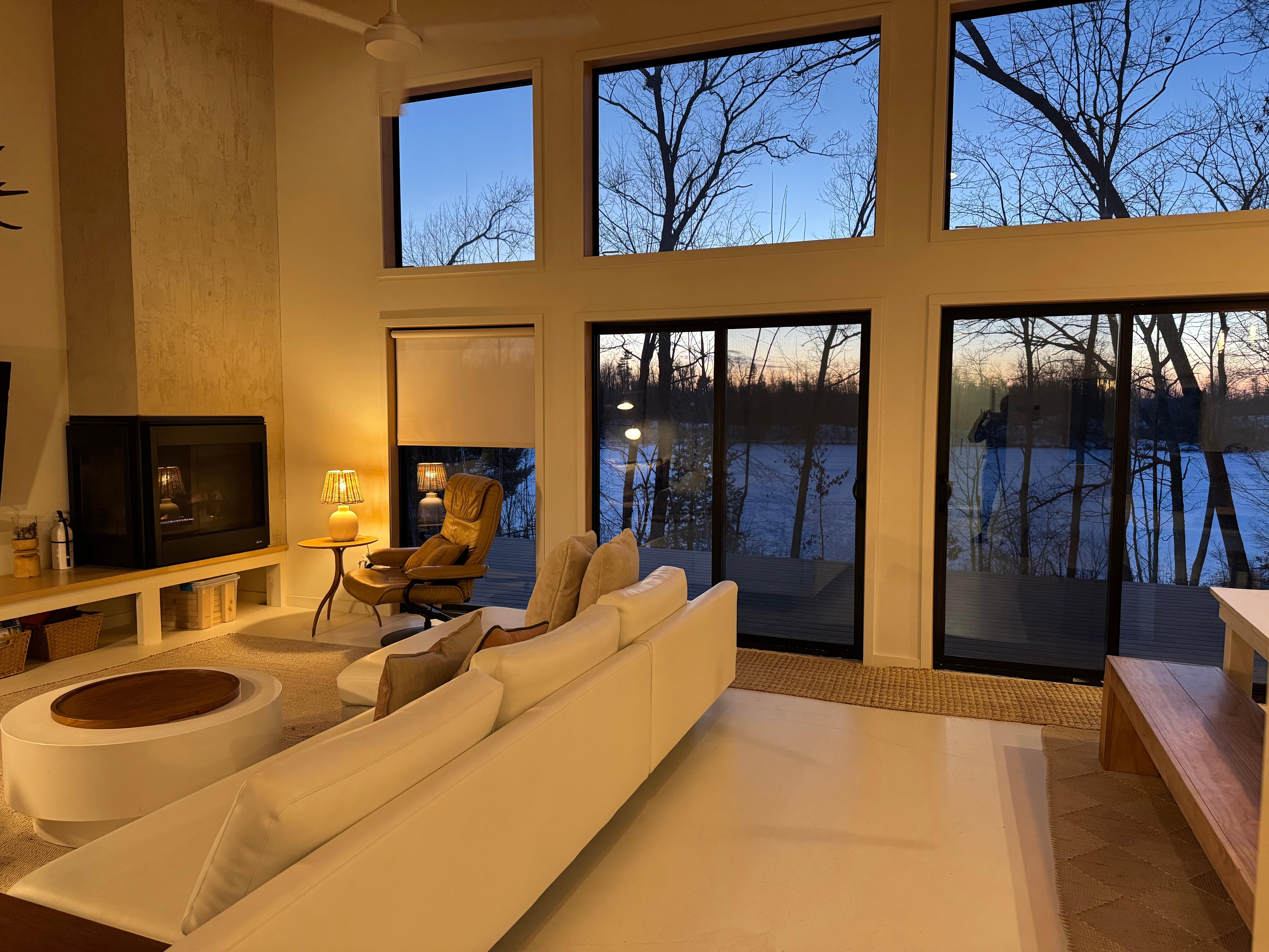 We finished building this modern Scandinavian cabin in spring 2020. The cabin sits at the end of the road on a private lot with a perfect view of sunsets over the nature side of the lake. Drive past farm fields and into the woods, turning onto our private gravel road, where you'll arrive at the driveway. Watch loons, tundra swans, eagles, beavers and deer while you relax by the lake, or jump in for a swim! You'll feel completely immersed in nature even when indoors with the huge wall of windows. Enjoy beautiful sunsets from the dock.