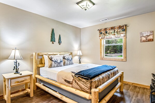 Inside both cabins, you'll find bright, welcoming interiors and a cozy atmosphere throughout the well-appointed living areas, all blanketed in natural light. Relax and make yourself at home by resting on the plush furniture, streaming movie marathons on the large TVs, or curling up in the glow of the grand stone fireplaces. The open-concept floor plans were designed with togetherness in mind so that no conversation would be lost here. Create culinary charms and snacks for your outdoor adventures in the sophisticated eat-in kitchens, equipped with brand-new appliances, ample cupboard room, and rustic dining tables. Host barbecues, serve cocktails, or sip your morning coffee on the patios while listening to the tranquil sounds of nature, and then gather around the firepit as the stars come out.