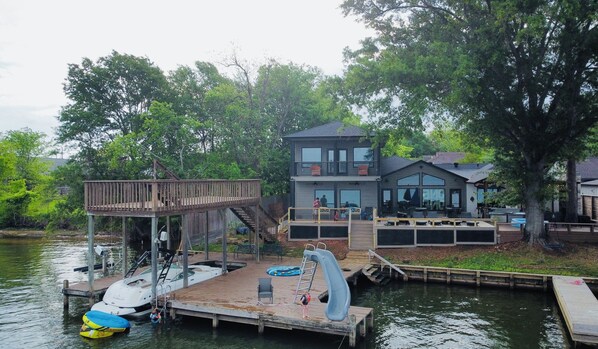 Denne vakre innsjøen hjem har alt som noen vacationer ønsker. Det har utsikt over det glitrende vannet i Lake Conroe og er oppgradert med tregulv, store åpne rom, gourmet kjøkken, granitt benkeplater og toppen av linjen apparater, høye tak og vakre vinduer over ryggen for lake visning. Dekket er komplett med jern møbler, stor gassgrill, brann gropen og massevis av dekk og båt dock for slappe av og nyte måltider og solnedganger.