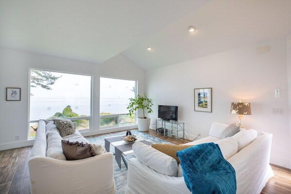 Åpne vinduene og sovne om natten til lyden av bølgene som krasjer på stranden nedenfor hjemmet ditt. Slapp av på det koselige vindbeskyttede dekket mens den strålende solen går ned bak Cape Arago-fyret på Chief Island. Ett hovedsoverom / master-bad og et gjesterom og gjestebad er i andre etasje; en queen-size skjule-en-seng i stuen har plass til ytterligere to gjester. Tredje etasje har en queen-size seng, bad, våt bar og kjøleskap, dobbel skjult seng og spillsenter.