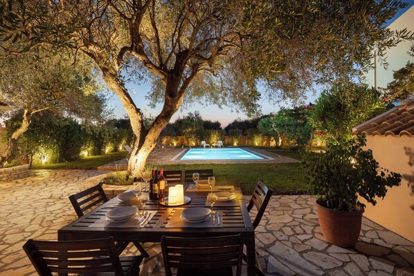 Utendørsområdet fullt av oliventrær inkluderer det private svømmebassenget, med solsenger, parasoller og dusj, en stor grill som også inkluderer en gresk tradisjonell vedovn, uteservering og en parkeringsplass for fem biler.