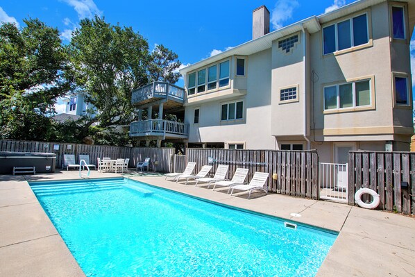 Extras: Private salt-water pool (32 x 16, heated for $500), Hot Tub, high speed wireless internet, ceiling fans, gas grill, cornhole boards, hammock swing, baby gate, books, games, wood fireplace, linens and towels provided and community pool and tennis. No Smoking No Pets. Seasonal Flex Stay available from October 1 - May 15. Beds: 3 Kings, 2 DuoBunks, Daybed, Trundle. House Address: 911 Monteray Drive. Key Type: Keyless entry. CHECK IN LOCATION: 1023 Ocean Trail, Corolla Office.