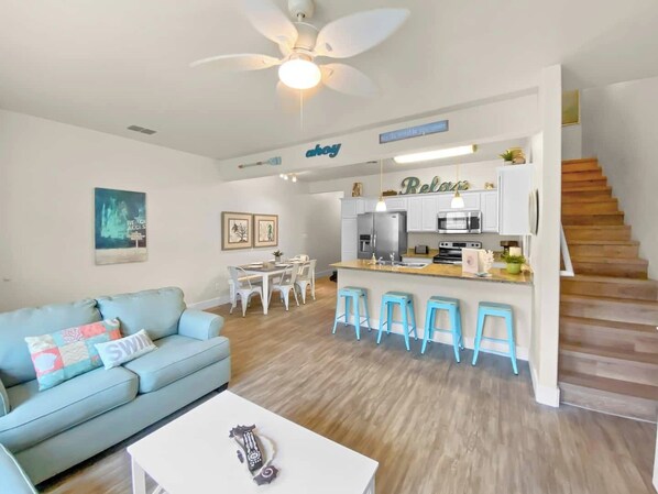 This open concept 3br/2ba townhome has over 1200 sq ft of indoor and outdoor space. This home has plenty of room to gather and create delicious meals, kickback and watch any of the 5 flat screen TVs!
