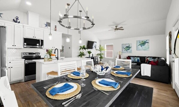 - Open floor plan: living, dining and fully equipped kitchen with modern appliances and a keurig/drip combo (12 cup) coffee maker.