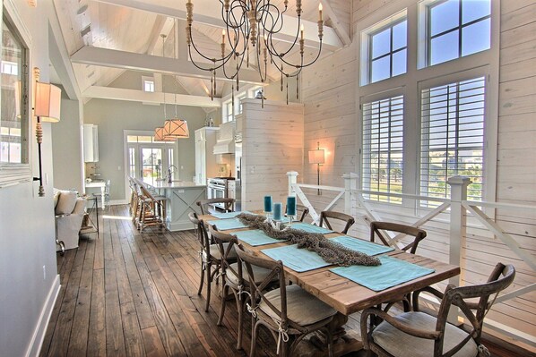 Lag minner for livet mens du bor på Oceanaire, et av de nyeste luksushusene i Cinnamon Shore. Dette tilpassede hjemmet med fem soverom, fem bad, har designermøbler, en fantastisk beliggenhet, fantastiske omkransede verandaer, Sonos surroundlyd, Apple TV i køyesalene, overbygget parkering og mye mer. Med Great Lawn som hage og Dune Park Pool over gaten, er utsikten fantastisk fra en av de to verandaene eller tårnet i tredje etasje. Første etasje har en king master suite med plysj sengetøy og et nydelig bad med eget bad. Det er også en køyesal med fire enkeltsenger, en kommode og lagringsplass under køyene. Med en 50 "Smart TV og Xbox er stuen i underetasjen perfekt for barna. Den store seksjonssofaen er en dronningstrekk for ekstra soveplass. Andre etasje har et profesjonelt kjøkken med avanserte apparater. Det åpnes inn i hovedområdet, hvor du kan slappe av på de frodige sofaene og stolene mens du lytter til favorittmusikken din fra Sonos surroundlydsystem. Verandaen har en gassgrill og stort utebord og har utsikt over plenen. Det er tre soverom i andre etasje og to har king-size-senger, begge med eget bad. Den tredje er en vakker køyeseng med to enkeltsenger, to ekstra store enkeltsenger og en stor, innebygd kommode. Tårnet i tredje etasje har fantastisk utsikt over havet, Great Lawn og Dune Park Pool. Slapp av på utemøblene og nyt Oceanaire. Du vil ikke finne en annen Port Aransas leie som dette. Vi vet at du vil elske dette luksuriøse, tilpassede hjemmet og dets fantastiske beliggenhet!