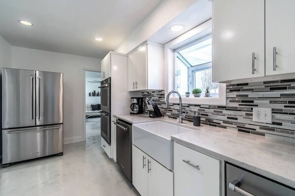 Open the front door with your unique digital code and step into a beautifully revamped living and dining space. With a vaulted ceiling, dual couches, a large Smart TV, and a rustic farm table, this area exudes a homely charm. Adjacent lies the galley-style kitchen, showcasing a brilliant layout for optimal cooking efficiency and equipped with essential cookware, dinnerware, and high-quality appliances.