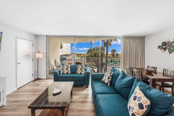 This well laid-out condo has a spacious living room with a queen sleeper sofa, a love seat and large flat screen Smart TV for streaming movies on a lazy afternoon from your personal Netflix or Hulu account.