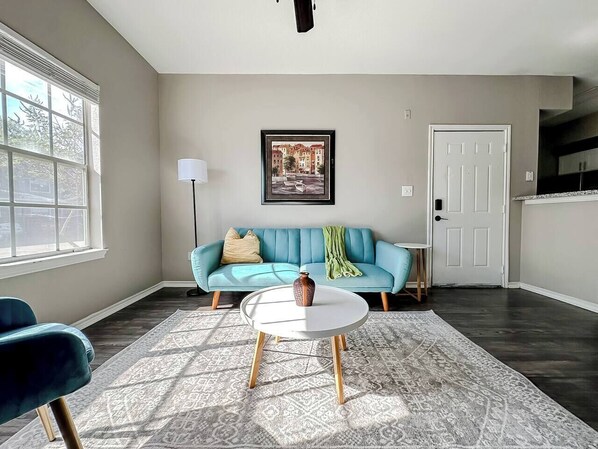 Enjoy a comfortable and well-equipped stay in this modern 1-bedroom apartment, offering everything you need for a relaxing and hassle-free experience. The space is fully furnished with all the essentials, including quality amenities and toiletries to make your stay enjoyable. The apartment includes a cozy living room, a functional kitchen, a comfortable bedroom, and a clean, well-maintained bathroom. For added convenience, the living room also features a futon, perfect for extra sleeping space. It’s the perfect choice for a practical and pleasant stay.